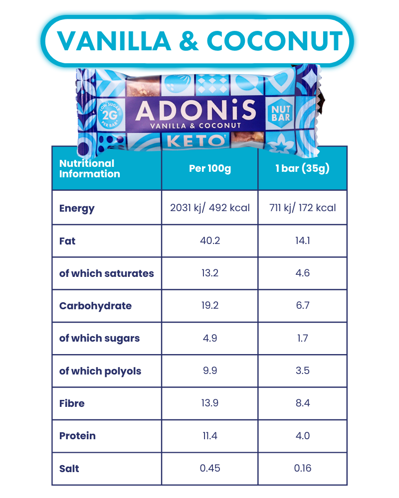 Discover both of our Adonis Keto Nut Bar flavours in one box — the tropical Vanilla & Coconut bar and the rich Pecan, Hazelnut & Cocoa blend. Each bar is made from natural ingredients, low in sugar and packed with healthy fats for clean, steady energy. With only 2–3g net carbs and 1–2g natural sugar, both flavours are fully vegan, gluten-free and Keto-friendly. The perfect way to taste the full range and find your favourite.